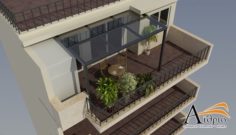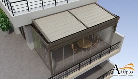 Στέγαση μπαλκονιού με σύστημα ψαλιδωτής ανοιγοκλειόμενης πέργκολας και πτυσσόμενα κρύσταλλα